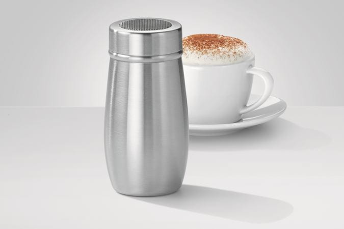 Με αυτό το κομψό δοχείο γαρνιρίσματος για κακάο από ανοξείδωτο ατσάλι με καπάκι-κόσκινο μπορείτε να διακοσμήσετε τον Cappuccino σας με λεπτή σκόνη κακάο για τέλεια αποτελέσματα. Με ξεχωριστό πλαστικό καπάκι για μέγιστη φρεσκάδα.